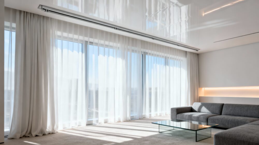 Команда монтажников приезжает на объект и профессионально устанавливает натяжной потолок, фиксируя его в предварительно установленном багете, обеспечивая ровную и эстетичную поверхность.